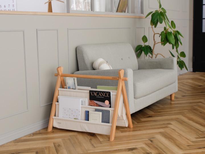 本や雑誌はもちろん、サイズの大きい新聞もしっかり収納でき、中央のスペースにはブランケットや小物類をまとめて入れられる設計です。