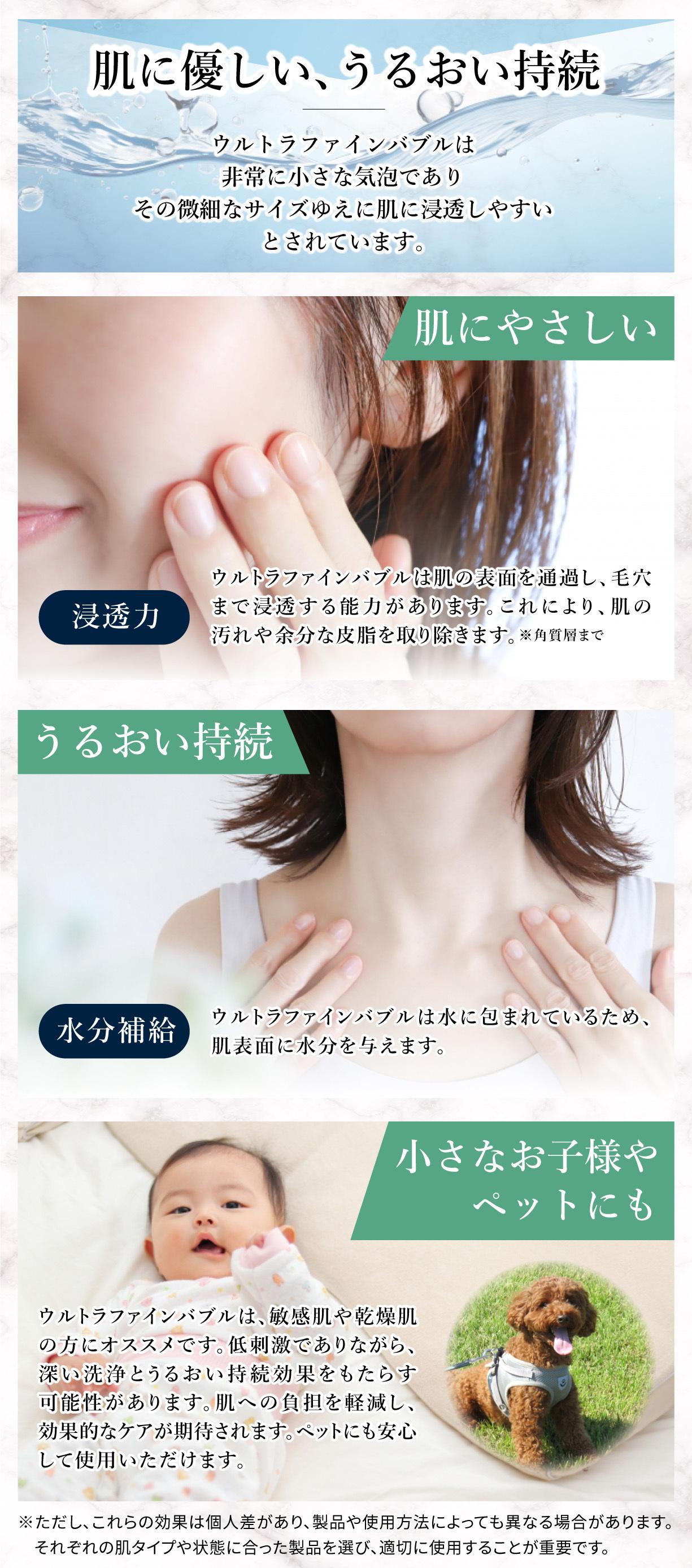 ・【界面活性剤残留対策】94.1ナノメートルの最大6200万個のウルトラファインバブルが生成されます。これらのウルトラファインバブルは、地肌のメイク残りや頭皮の皮脂汚れに対処し、地肌や頭皮をクリアに保つ効果が期待されます。キャビテーション方式に外気吸引を合わせることで大量のバブルを安定して発生