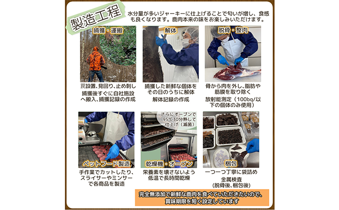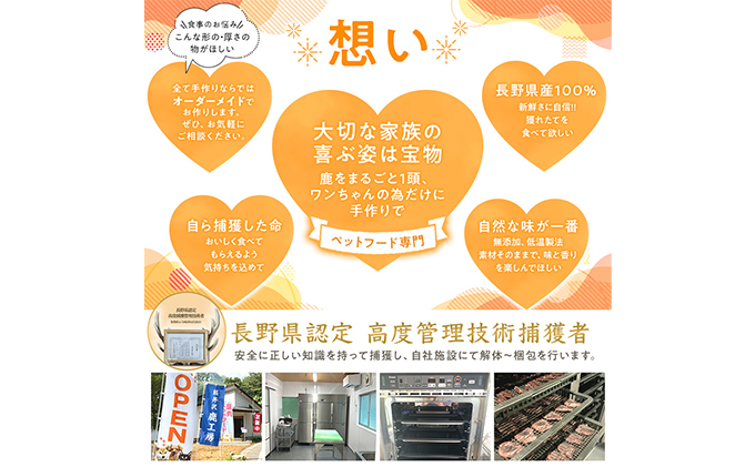 弊社では<大自然の恵みに感謝し、命を無駄にしない>をコンセプトに、長野県高度管理技術捕獲技術者の認定をいただいております代表自らも捕獲を行い、捕獲した当日の鹿のみを使用し衛生管理を徹底した自社施設で解体から商品梱包を行なっております。