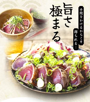 藁焼き効果によって香ばしさを加え、鰹の美味しさを引き立たせております。