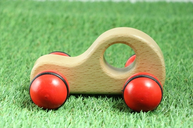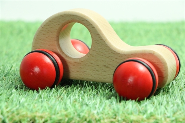 タイヤは木球を使い、まあるいデザインがかわいらしいです。タイヤにはエラストマーのリングを付け、フローリングの床をキズつけにくくしました。