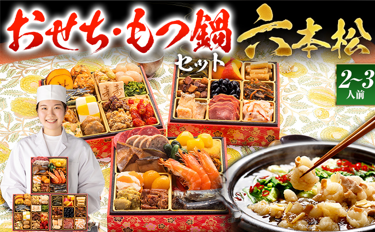 博多久松自慢の本格おせちと国産和牛小腸100%のこだわりもつ鍋を一緒にお楽しみいただける贅沢セットです。
