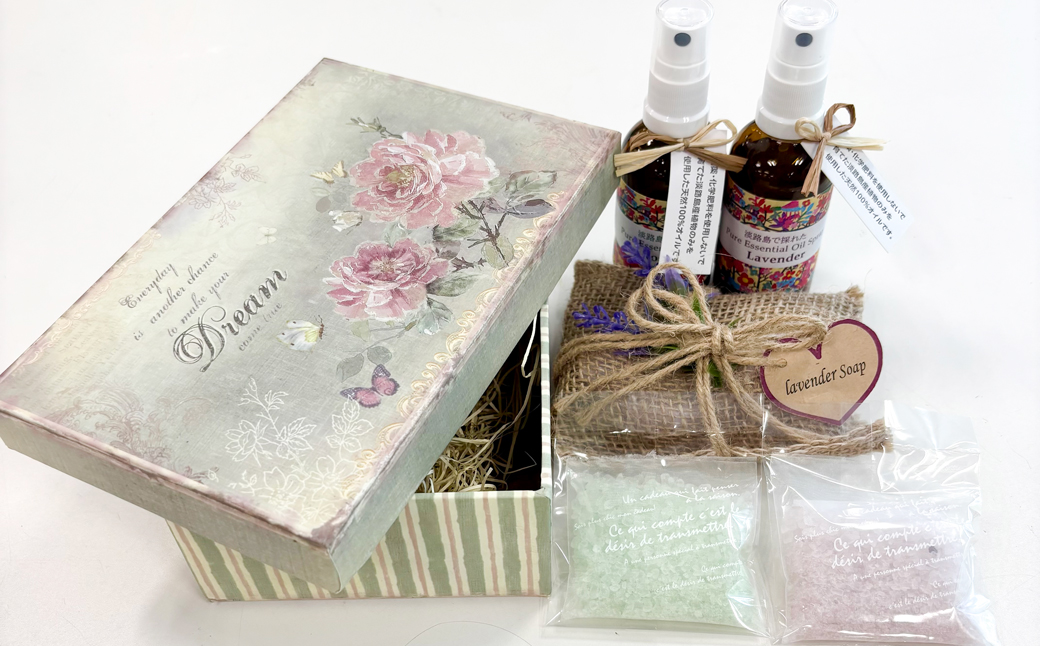 天然オイルをブレンドしたスプレー、ソープ、バスソルトをギフトセットに致しました。