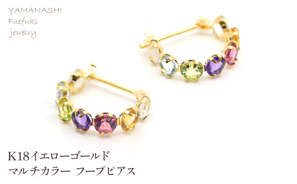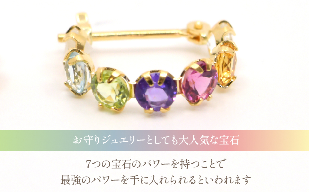 レインボーカラーの華やかな18金のフープピアスです。虹色の宝石は昔から「アミュレット」お守りジュエリーとして人気の高い宝石です。7つの宝石のパワーを持つことで最強のパワーを手に入れることができると信じられてきました。ブルートパーズ・シトリン・ピンクトルマリン・アメジスト・ペリドット・アクアマリン・ムーンストーンと7石のカラーのバランスはフェミニンで花束のような優雅な印象です。モノトーンのコーディネイトのアクセントとして大人の女性のカワイイを演出します。