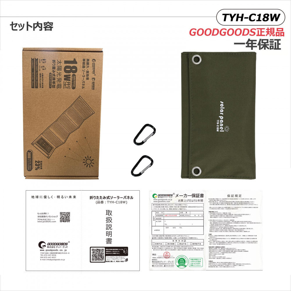 セット内容:ソーラーパネル、カラビナフック*2個、取扱説明書、保証書