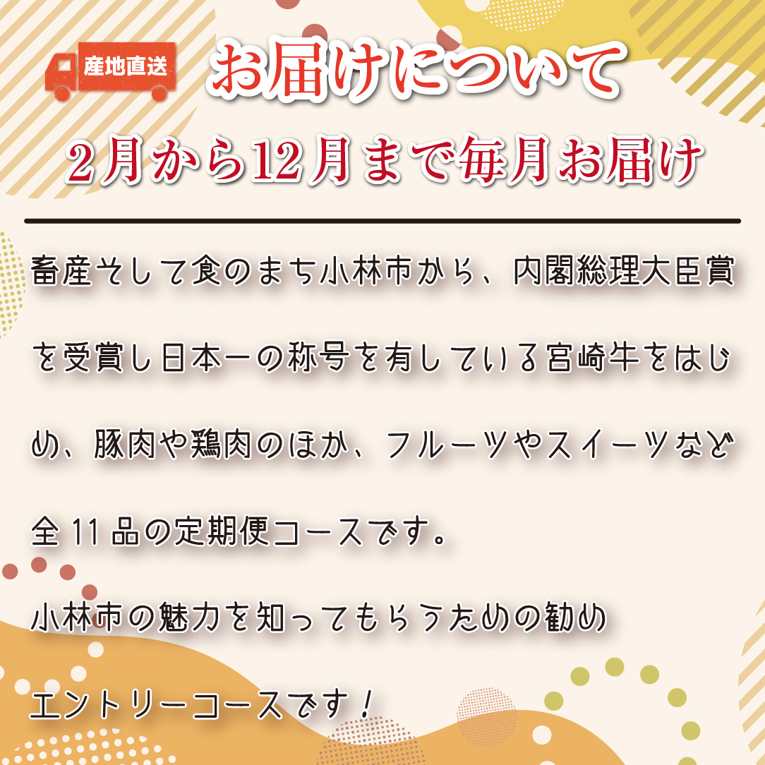畜産そして食のまち小林市から、内閣総理大臣賞を受賞し日本一の称号を有している"宮崎牛"や黒豚、朝挽き鶏炭火焼、加えてフルーツや新米のヒノヒカリをお届けする全11回の定期便コースです。