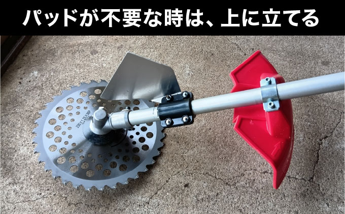 (パッドに詰まった時にはエンジンを低速にして刃を止め、草刈り機を手前に引き草刈り刃を反転すれば取れます。)