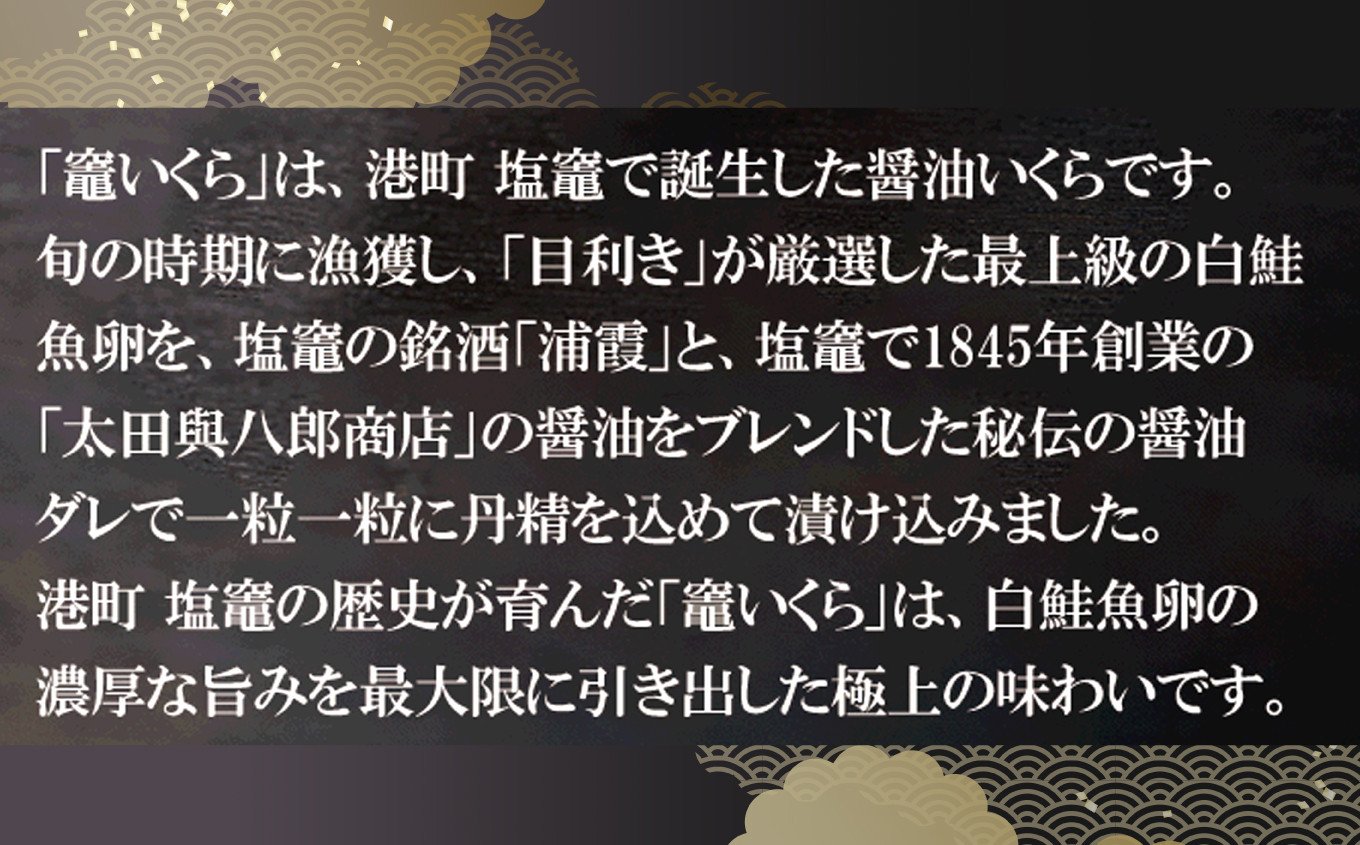 港町塩竈の歴史が育んだ「竈いくら」は、白鮭魚卵の濃厚な旨みを最大限に引き出した極上の味わいです。