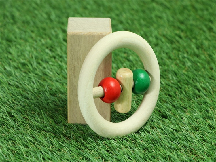 リング部分を握って振ると、中心部の球が動いて木独特のやさしい音を奏でます。赤ちゃんがぐずった時、あやすのに使えるのはもちろん、赤ちゃん自身が握って遊ぶこともできます。
