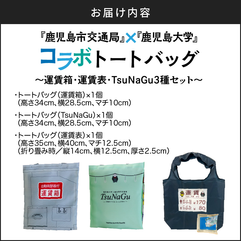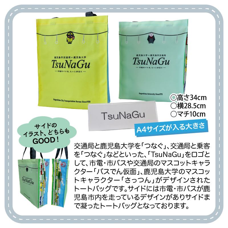 交通局と鹿児島大学を「つなぐ」、交通局と乗客を「つなぐ」などといった、「TsuNaGu(つなぐ)」をロゴとして、市電・市バスや交通局のマスコットキャラクター「バスでん仮面」、鹿児島大学のマスコットキャラクター「さっつん」がデザインされたトートバッグです。