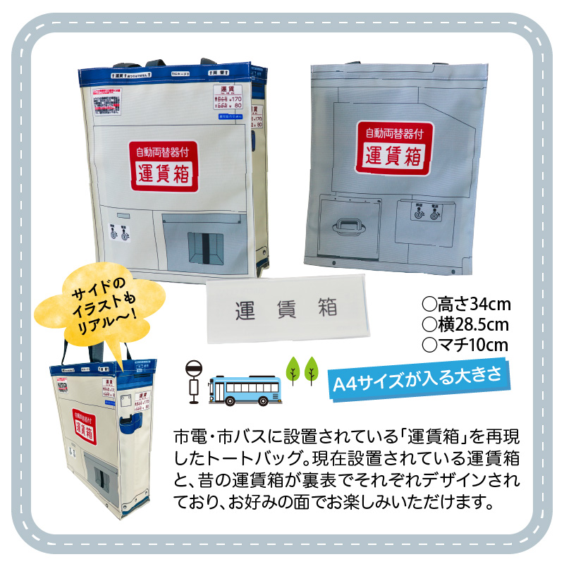 市電・市バスに設置されている「運賃箱」を再現したトートバッグ。