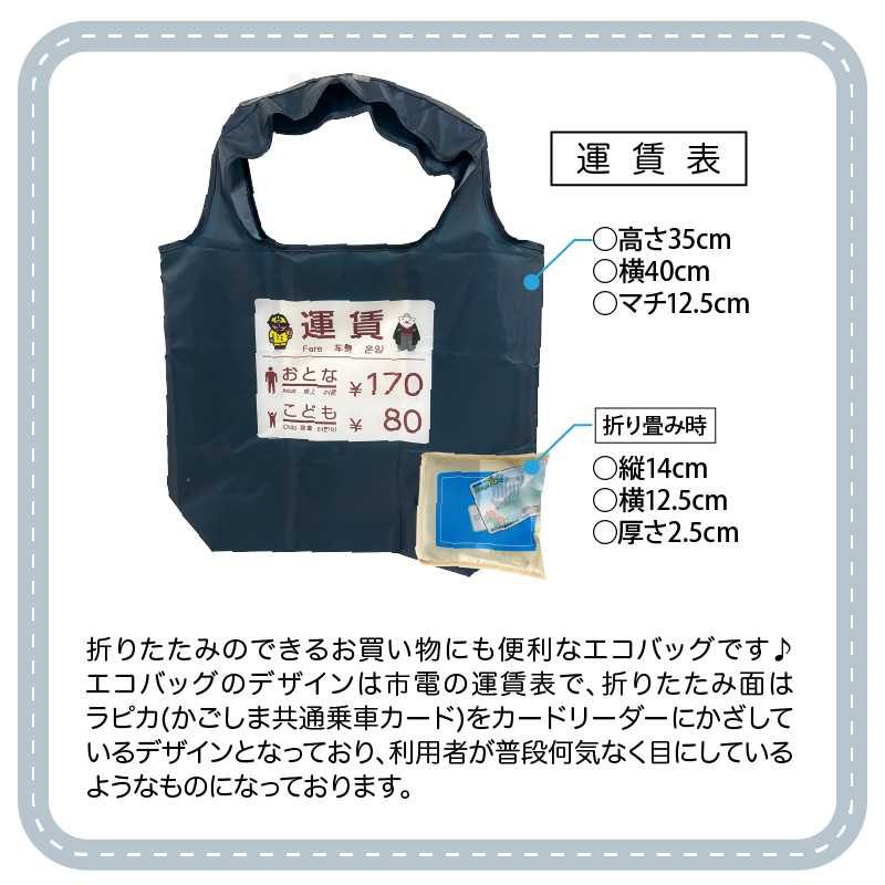 エコバッグのデザインは市電の運賃表で、折りたたみ面はラピカ(かごしま共通乗車カード)をカードリーダーにかざしているデザインとなっており、利用者が普段何気なく目にしているようなものになっております。