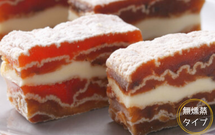 無燻蒸の干し柿の生産は技術面で想像を超える手間がかかり、安易に大量生産をすることができないため、プレミアムな市田柿ミルフィーユとなっています。