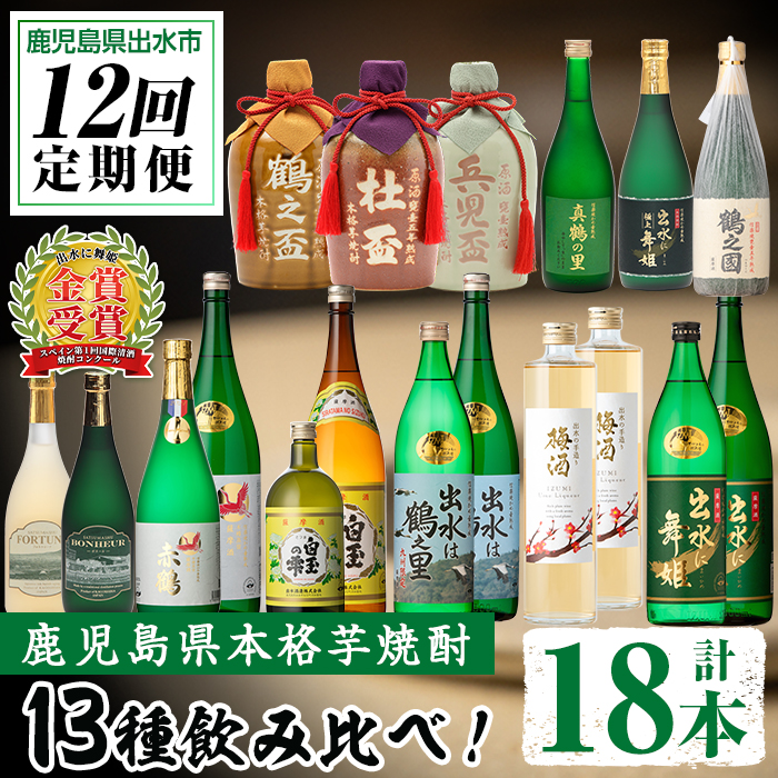 鹿児島県出水市にある出水酒造の代表銘柄「出水に舞姫」やミズナラの木樽で熟成した「フォルトゥーナ」など、数々の賞を受賞した本格芋焼酎の13種18本を年12回に分けて毎月お届けいたします。