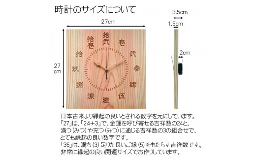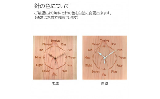・尚、時計に使用する杉材は、良質のものを厳選しておりますが、自然の材料ですので、完成品の木目や色見が画像のサンプルと違って見える場合がありますが、ご了承下さい。