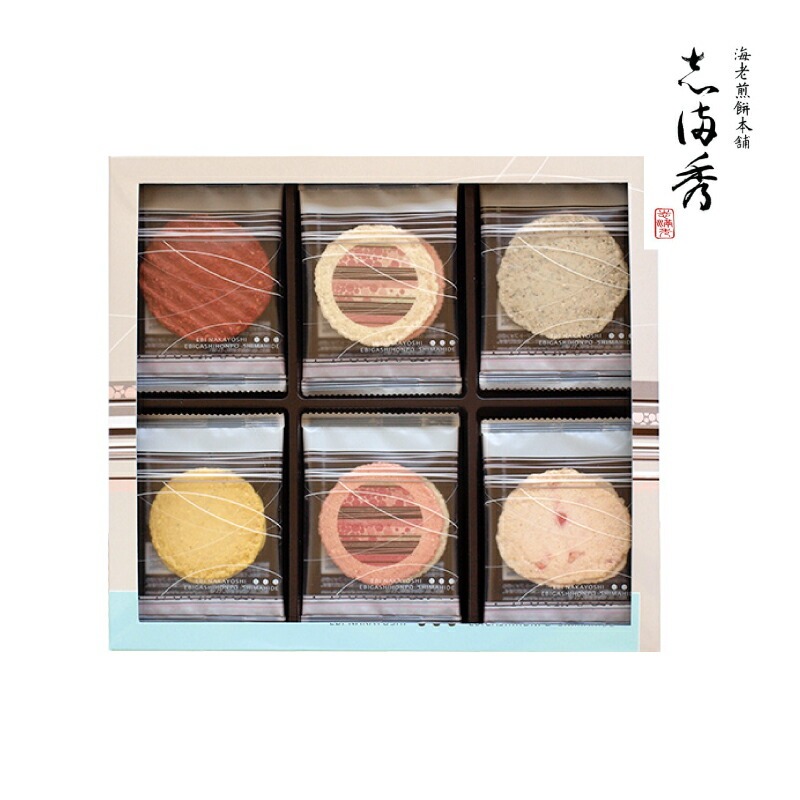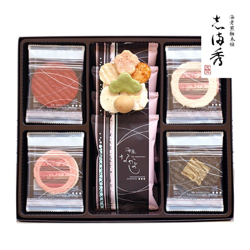 ・えびのだんらん×4袋・ふた焼辛子明太子×3袋・えび柚子胡椒×3袋・黒ごまえび煎餅×2袋・紅白せんべいチーズサンド×4袋・紅生姜えび煎餅×2袋・えび小笹×2袋・ふた焼ごま×2袋・ふた焼イカスミ昆布×3袋・のりえびせん×3袋