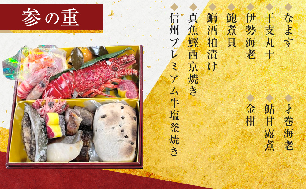 なます・干支丸十・伊勢海老・鮑煮貝・鰤酒粕漬け・真魚鰹西京焼き・塩釜焼き・才巻海老・鮎甘露煮・金柑