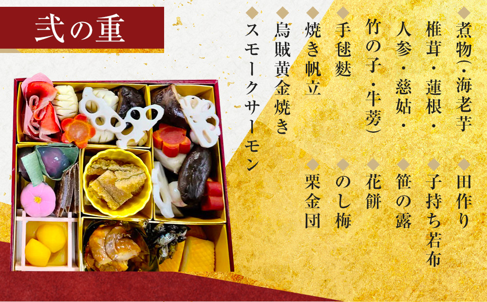 煮物(海老芋・椎茸・蓮根・金時人参・慈姑・筍・牛蒡)・手鞠麩・焼き帆立・烏賊黄金焼き・田作り・スモークサーモン・子持ち若布・笹の露・花餅・のし梅・栗金団