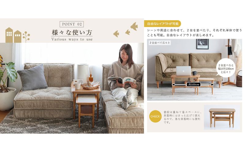 ネストテーブル本来の特徴でもある、大小のテーブルを並べたり、重ねたり、個別の用途でしたりと自由なレイアウトを楽しんでいただけます。