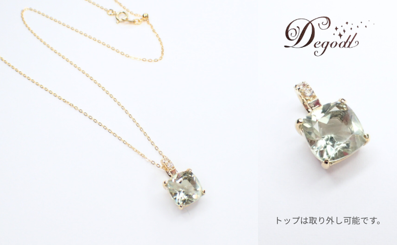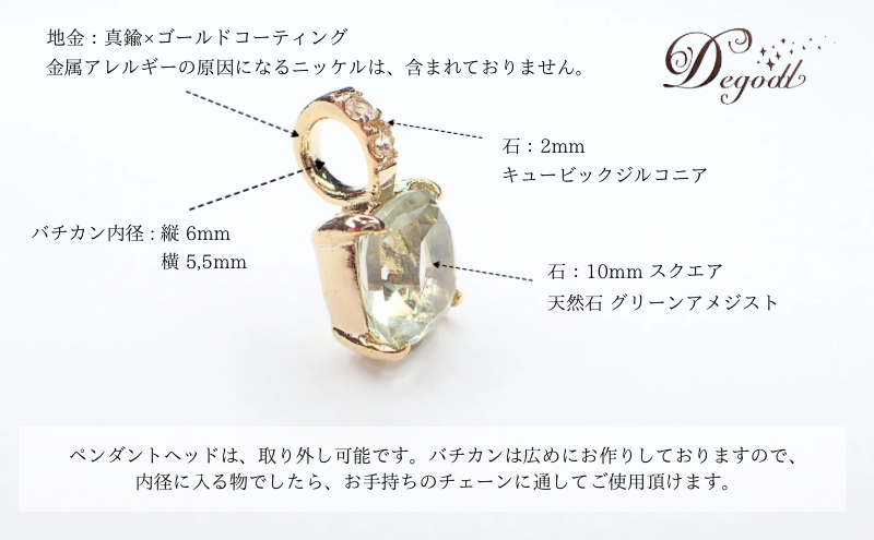 天然石グリーンアメジストネックレス 1点 内容量:約3g 素材:天然石グリーンアメジスト10mm×10mm、キュービックジルコニア2mm、真鍮×ゴールドコーティング(ニッケルフリー)、チェーン:真鍮×ゴールドコーティング約50cm、原産地:日本/千葉県