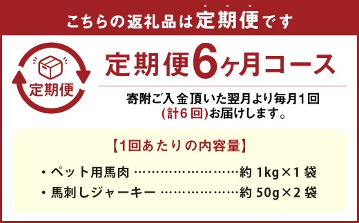 【6回定期便】 ペット用 馬肉 約1kg(1袋)+馬刺しジャーキー 約100g(約50g×2袋) 約1.1kg×6回 計約6.6kg ジャーキー 馬刺し 馬刺 馬 お肉 肉 ペットフード おやつ ごはん ご飯 餌 えさ エサ 冷凍