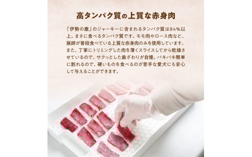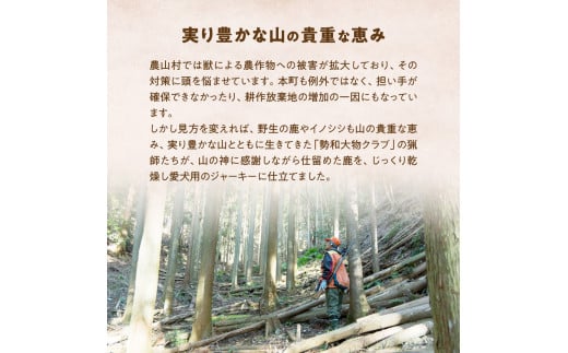 しかし見方を変えれば、野生の鹿やイノシシも山の貴重な恵み、実り豊かな山とともに生きてきた「勢和大物クラブ」の猟師たちが、山の神に感謝しながら仕留めた鹿を、じっくり乾燥し愛犬用のジャーキーに仕立てました。