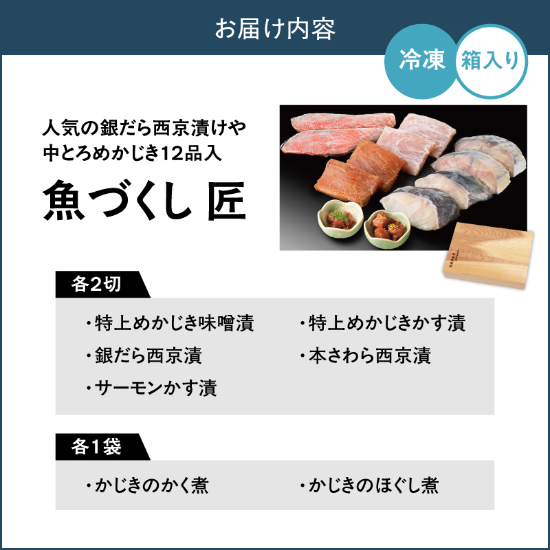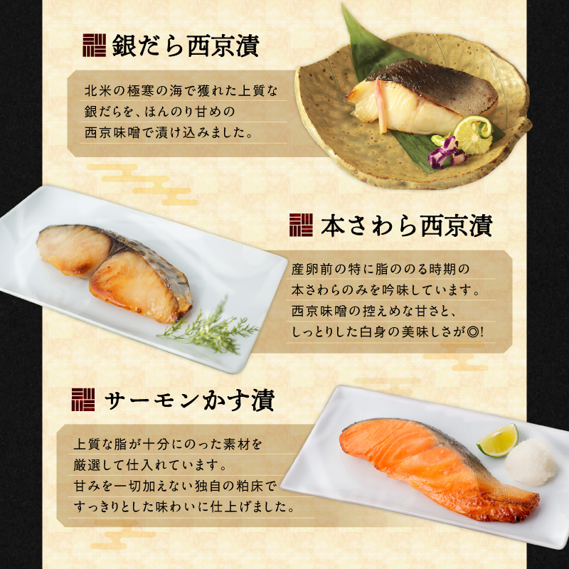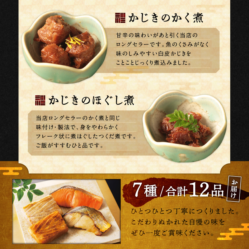 人気の銀ダラ西京漬など特上品の漬け魚5種類、手作りのつくだ煮2種類の豪華な詰合せです。