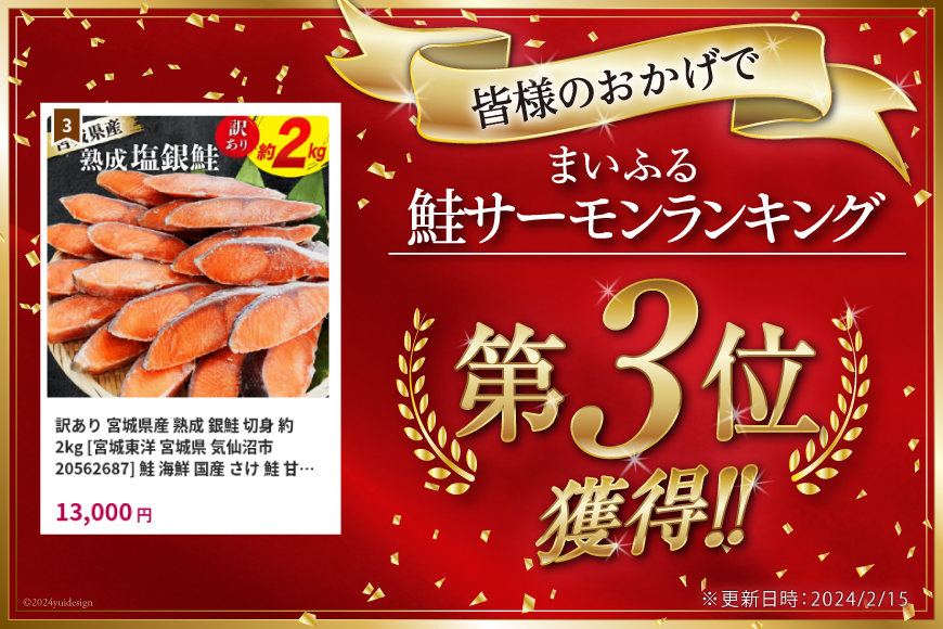 ![訳あり 宮城県産 熟成 銀鮭 切身 約2kg [宮城東洋 宮城県 気仙沼市 20563343] 鮭 海鮮 魚介類 国産 さけ 鮭 甘口 サケ 鮭切身 シャケ 切り身 冷凍 おかず 弁当 支援 事業者支援 サーモン 魚 銀鮭切り身](https://www.furusato.aeon.co.jp/g_img/042056/file_a5d0419ec2ab1f1fdfea2d58382739ef.webp)