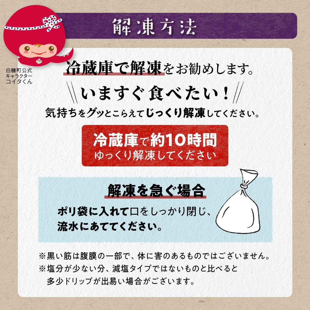 なお、塩分が少ない分、減塩タイプではないものと比べると多少ドリップが出易い場合がございます。