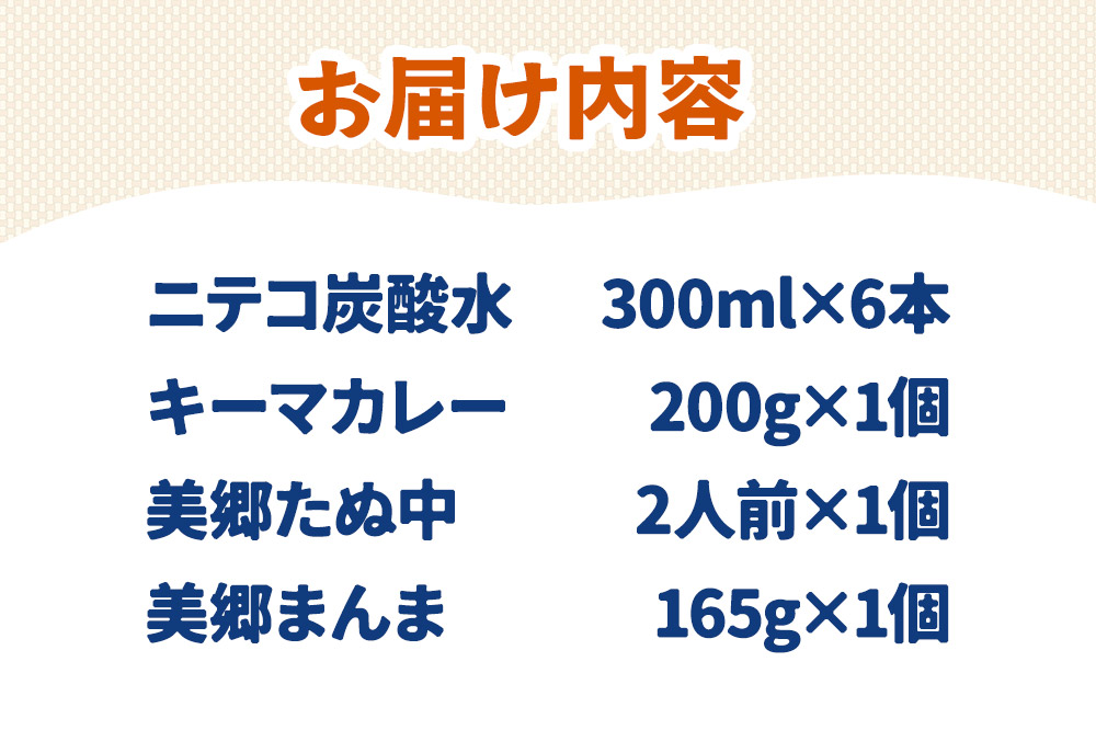 秋田県美郷町の豊かな水源と良質な水質の水を使用したニテコ炭酸水と、美郷ご当地グルメ「美郷たぬ中」と「美郷黒毛和牛のキーマカレー」と「美郷まんま」をセットにしてみました。