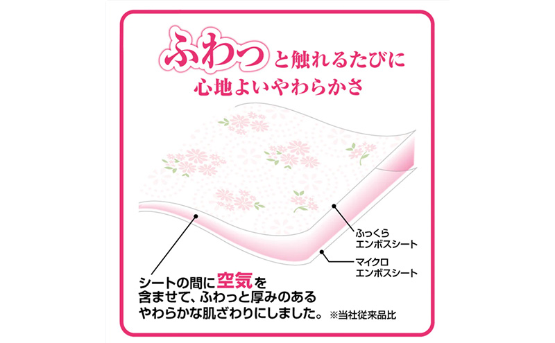 シートの間に空気を含ませて、ふわっと厚みのあるやわらかな肌ざわりにしました。 ※当社従来品比