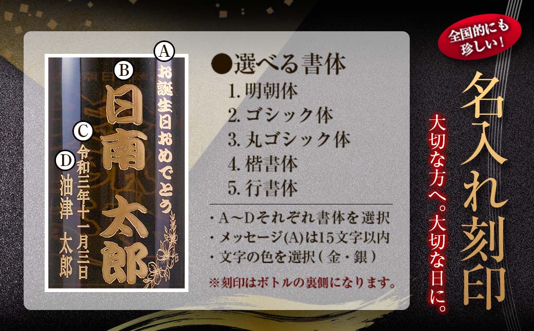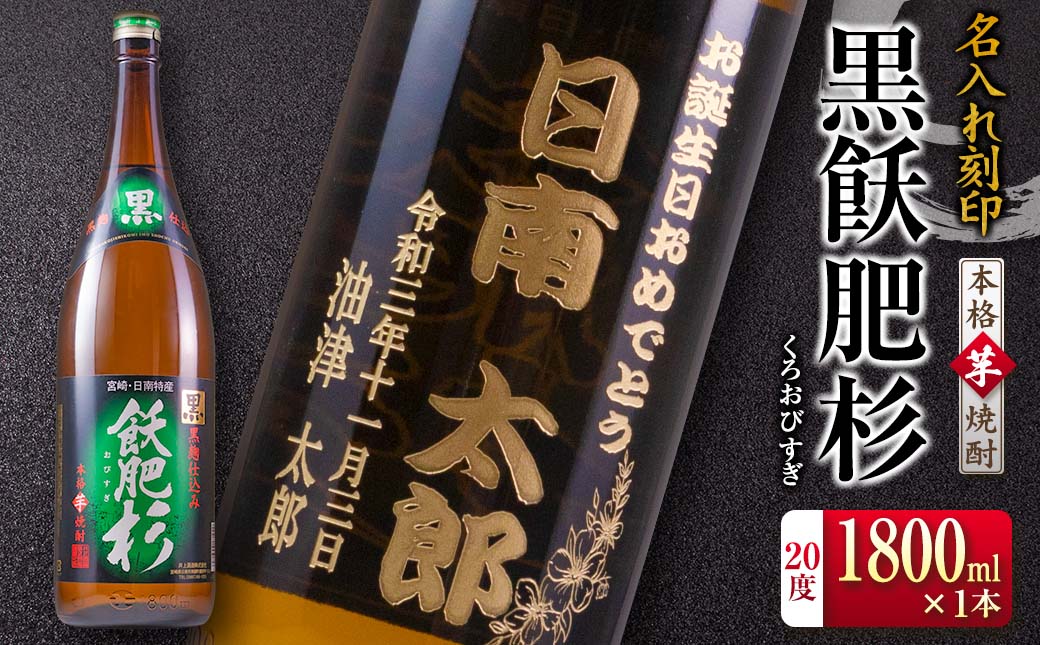 日南市で古くから続く酒蔵の芋焼酎「黒飫肥杉」のボトルにご希望のメッセージなどを刻印してお届けいたします。