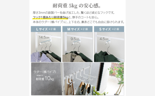 - ●サイズ:約 幅55.5×奥行11×高さ210-270cm ●重量:6.3kg ●カラー:ホワイト ●材質:スチール(アクリル塗装) ●付属品:フック(L)×2個・(M)×2個・(S)×2個、プレート2枚 ●耐荷重:総耐荷重/30kg (ラダーパイプ1本あたり10kg、フック1個あたり5kg)