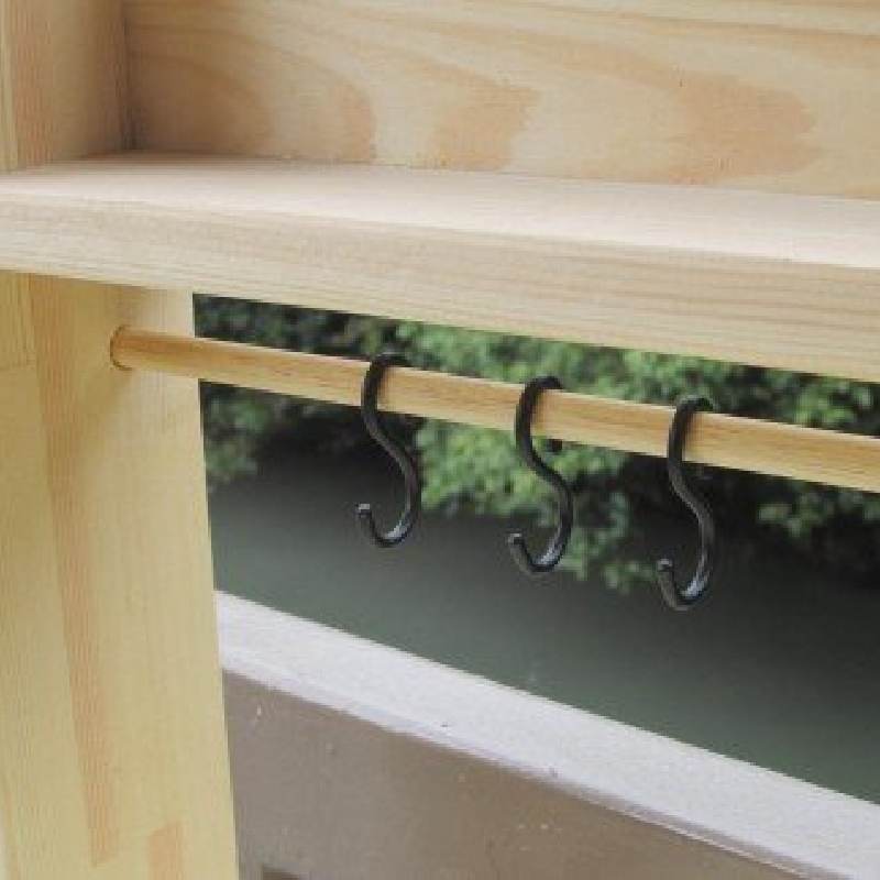 取り外し可能な上部の棚が付いたフル装備のままごとキッチンです。広い棚の下には、フックが3つ付いていますので、調理器具も付けられます。