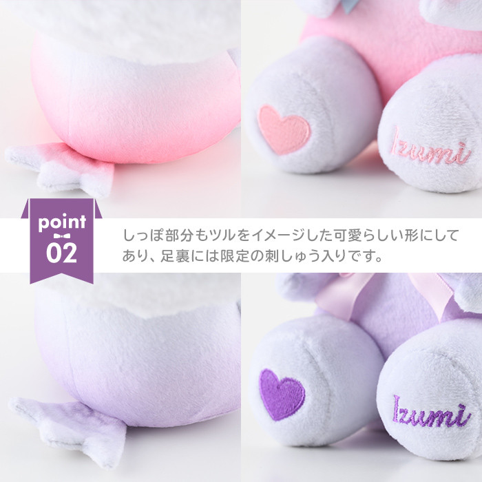 ツルをイメージし、手は羽の形で、ふわふわの頭巾をかぶっています。白いポンポンは羽をイメージしました。足裏には限定の刺しゅう入りです。