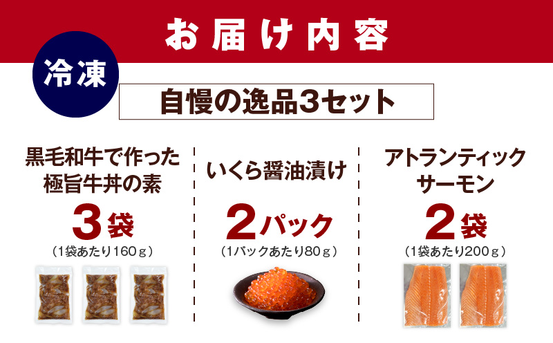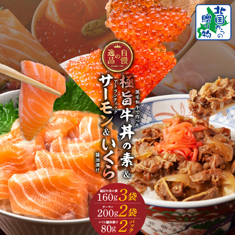 大人気のアトランティックサーモンに、自慢のいくら醤油漬け、さらに自信作の牛丼まで楽しめるセットです!
