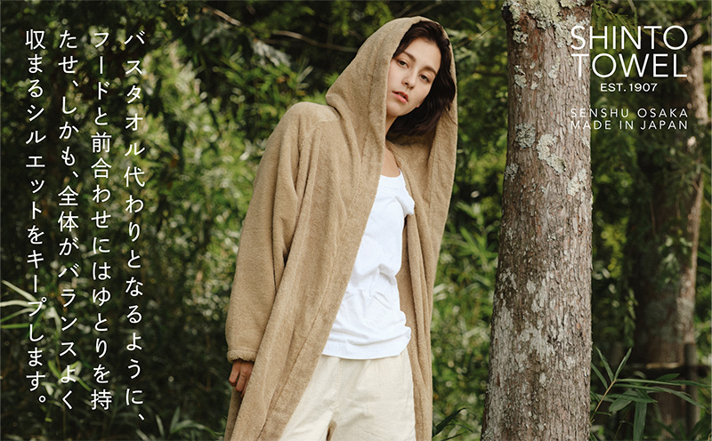 中が空洞になっている糸を一部使うことでより軽く柔らかく肌触りのよい生地に仕上げ、肩の可動域が広いラグラン袖で、ひじから袖口はもたつかないコンパクトなシルエットに。バスタオル代わりとなるようにフードと前合わせにはゆとりを持たせながら、全体がバランスよく収まるシルエットをキープしています。