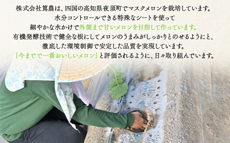 有機発酵技術で健全な根にしてメロンのうまみがしっかりとのせるようにと、徹底した環境制御で安定した品質を実現しています。