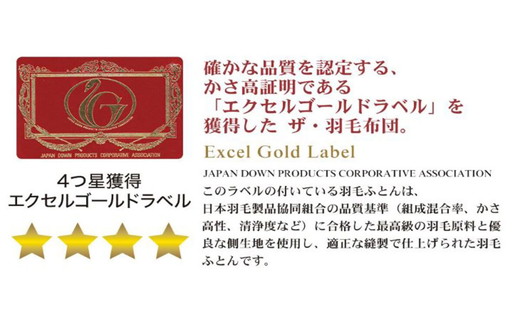こちらのページでお申し込みできる「ザ・羽毛布団」は、4つ星獲得の「エクセルゴールドラベル」認定です。