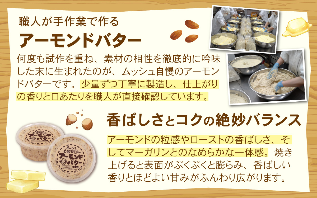 何度も試作を重ね、素材の相性を徹底的に吟味した末に生まれたのが、ムッシュ自慢のアーモンドバターです。