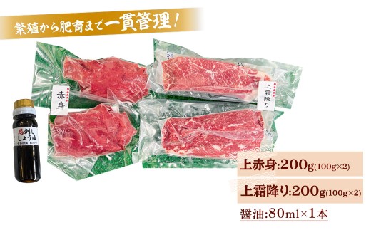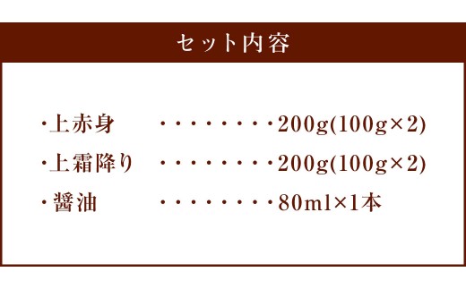 - ・上赤身:200g(100g×2) ・上霜降り:200g(100g×2) 合計400g ・醤油:80ml×1本