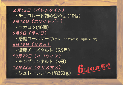 大切な人への贈りものに、または自分へのご褒美に楽しんでいただけるスイーツを季節のイベントに合わせて、計6回お届けします!