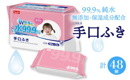 L99.9 手口ふき (w80枚×3個)×16袋 お手拭き 無添加 保湿 弱酸性 メッシュシート 日本製 日用品 送料無料 モモ葉エキス コラーゲン パッチテスト 純水 アルコールフリー パラベンフリー 無香料 無着色