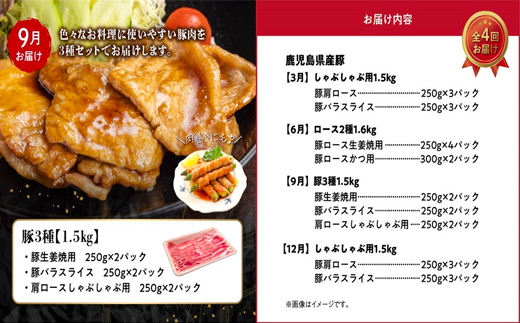 【9月】豚3種1.5kg:豚生姜焼用250g×2パック、豚バラスライス250g×2パック、肩ロースしゃぶしゃぶ用250g×2パック