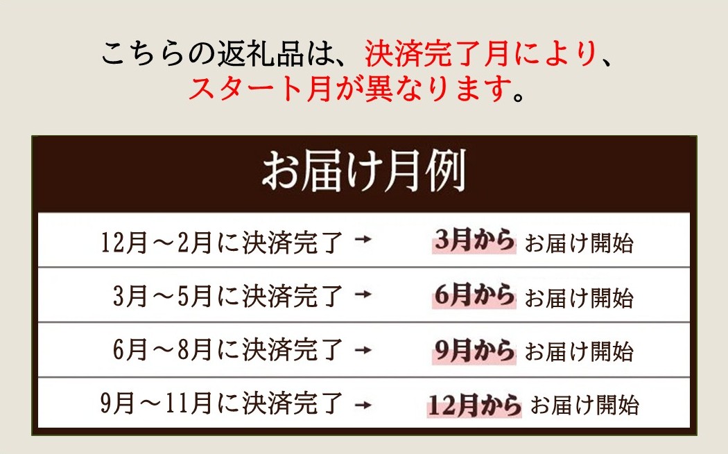 決済完了の翌月より、3月、6月、9月、12月の計4回、毎回20日〜30日の間にお届けいたします。