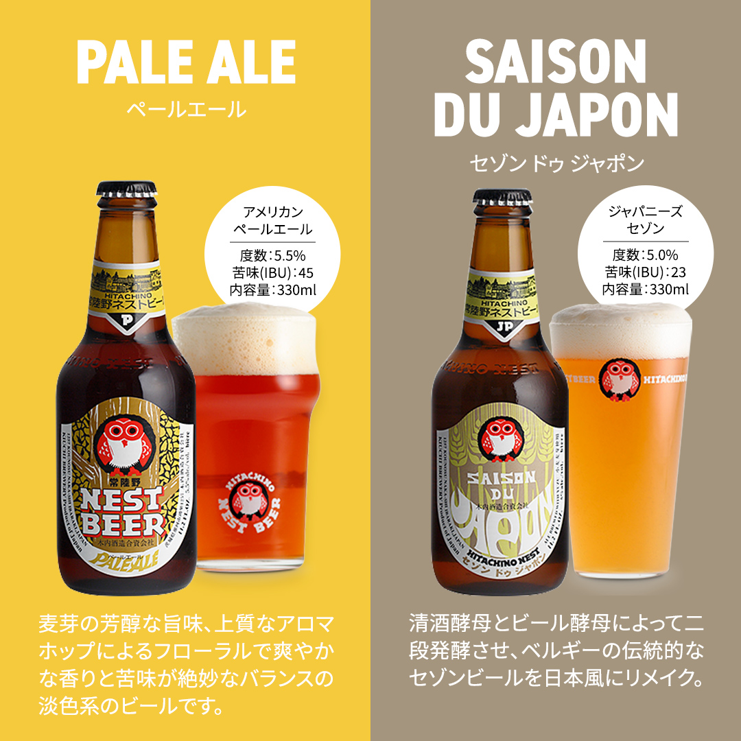 「福来みかん」を使用しただいだいエール、定番人気のホワイトエール、麦芽の香ばしさとほのかな甘味、ホップの華やかな香りが溶け合ったアンバーエール、麦芽の芳醇な旨味、爽やかな香りと苦味ペールエール、ベルギーの伝統的なセゾンビールを日本風にリメイクしたセゾンドゥジャポン。常陸野ネストビール6種を楽しめる飲み比べセットです。