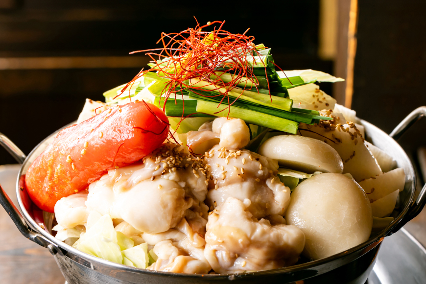 プリプリの国産牛もつと明太子のプチプチ食感、食材の旨味も食感も楽しめる本場九州のもつ鍋です。お野菜をたっぷり入れて、締めのちゃんぽんまでぜひご堪能ください。