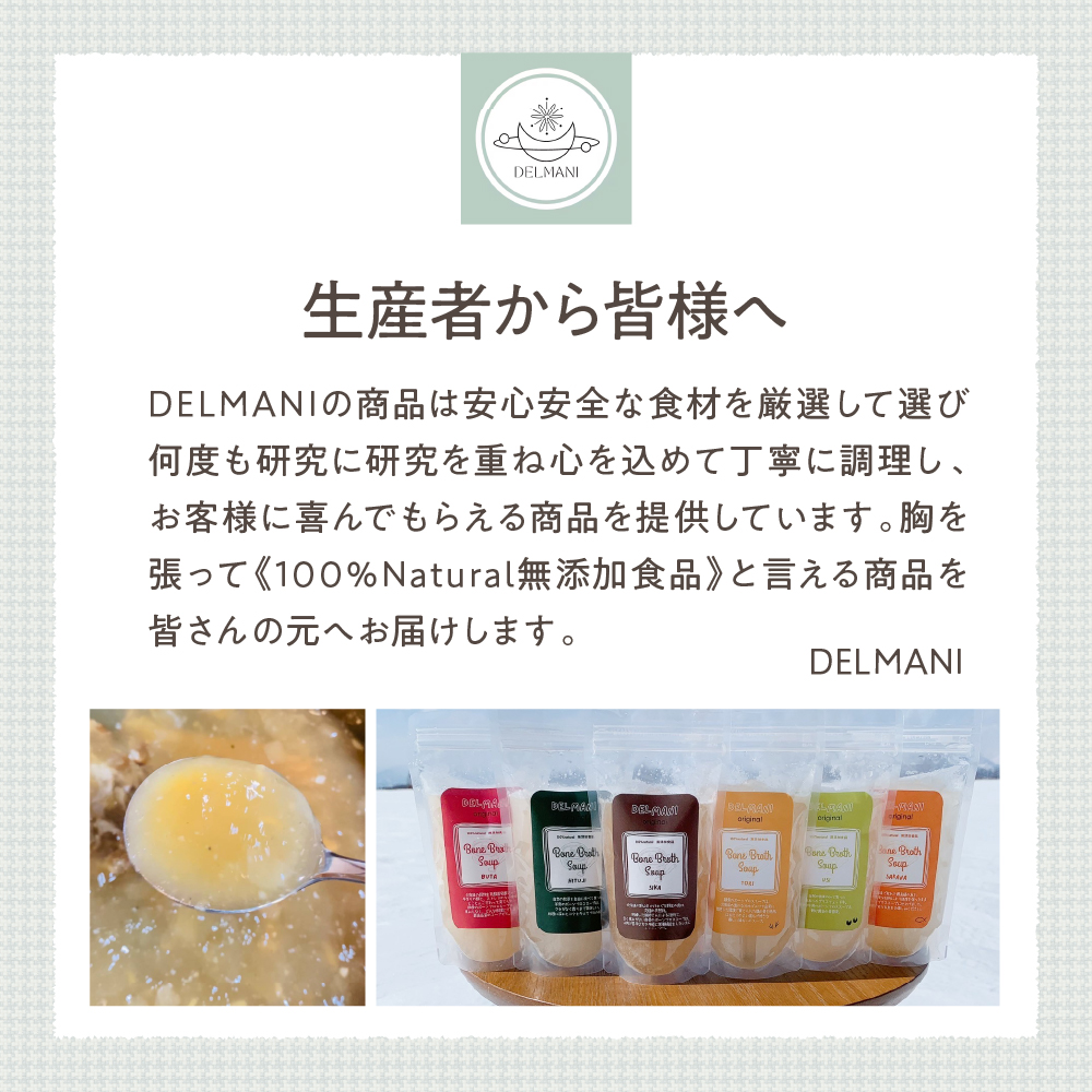DELMANIのボーンブロススープは「北海道産の骨」「野生または平飼い」「手作りのエサ&ストレスのない環境で飼育」「厳選して選んだ安心安全な食材」にこだわり、すべての工程を手作業で行っております。