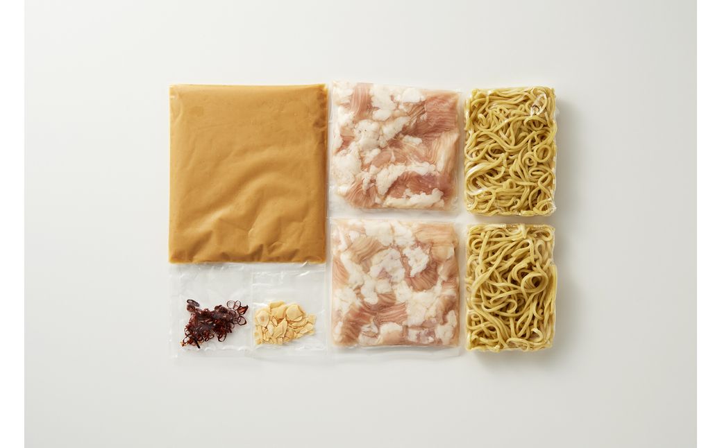 牛モツ:アメリカ産牛シマチョウ 味噌スープ:みそ(国内製造)、乳等を主原料とする食品、米発酵調味料、おろしにんにく加工品、ポークエキス、砂糖、かつお調味エキス、生姜、酵母エキス/調味料(アミノ酸)、香料、(一部に小麦・乳成分・大豆・豚肉を含む)
