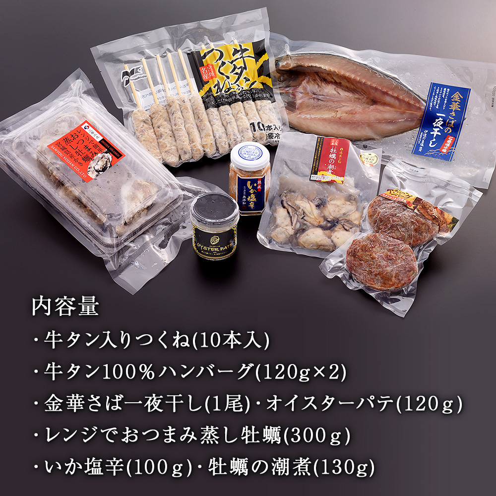 ・牛タン入りつくね(10本入) ・牛タン100%ハンバーグ(120g×2) ・金華さば一夜干し(1尾) ・オイスターパテ(120g) ・レンジでおつまみ蒸し牡蠣(300g) ・いか塩辛(100g) ・牡蠣の潮煮(130g)